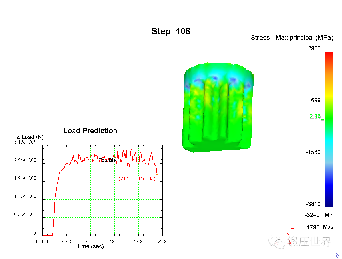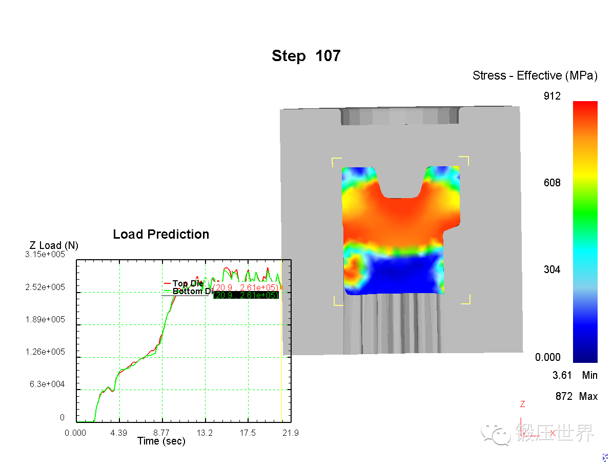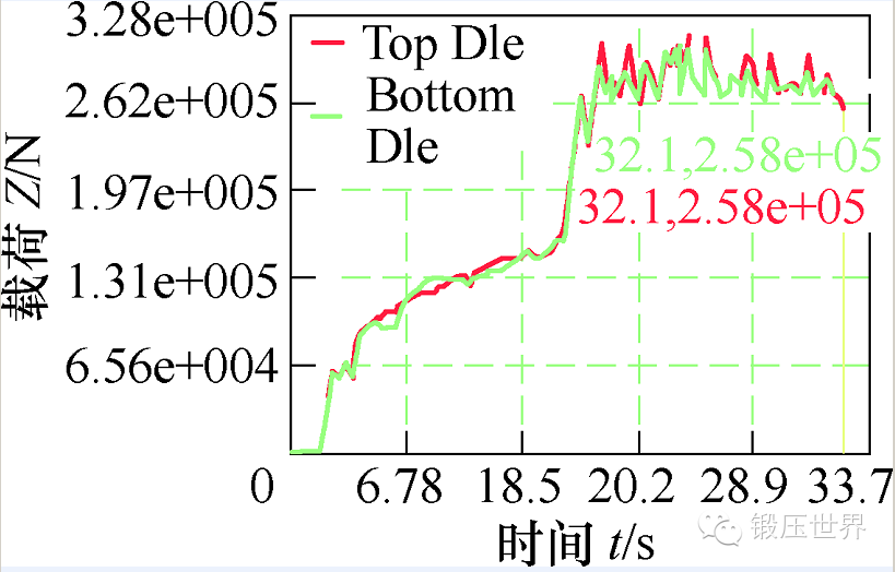 对坯料为29mm和28mm的情况进行分析。模型中采用一个齿进行了分析。图5显示了模拟结果。成形过程中坯料在冲压力的作用下,首先发生镦粗到与上凹模完全相同的直径,然后才成形齿轮。从图中可看出,冲头受力变化不大,但是齿头部分的充型较差,均超过了5mm。说明不宜采用过小的坯料。