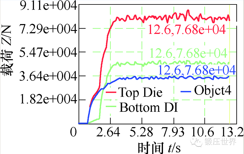 (4)凹模形状 凹模形状包括入口角、圆角等,此部分从理论分析即可得出,入口角度越大越好,圆角也是越大越好。本部分主要考虑凹模内部加入一个芯棒后对成形过程的影响。模拟中只分析一个齿。芯棒圆角为3mm,直径为10mm、12mm、14mm。图9显示了模拟结果。从图中可看出,凹模所受力基本不变(45kN),变化的是芯棒所受的力。10mm、12mm和14mm芯棒所受的力(Z方向)为16kN,24kN和35kN。冲头所受力等于凹模和芯棒所受力之和。所以随着芯棒直径增加,冲头所受力也增大,但是凹模力不变,因而齿成形所需的力是不变的。