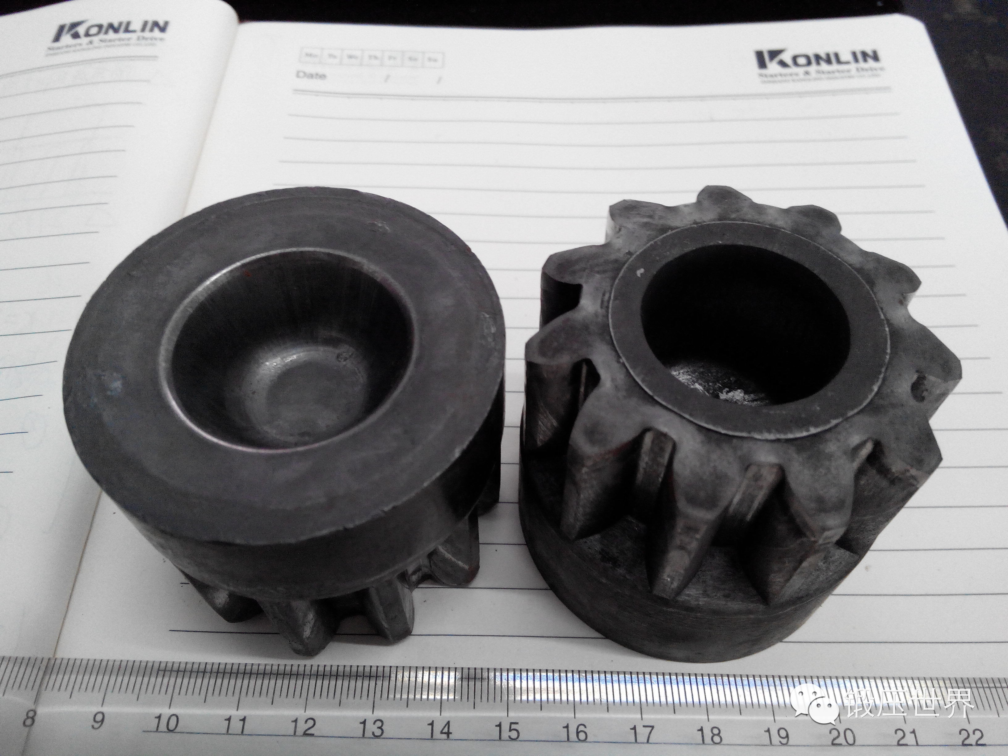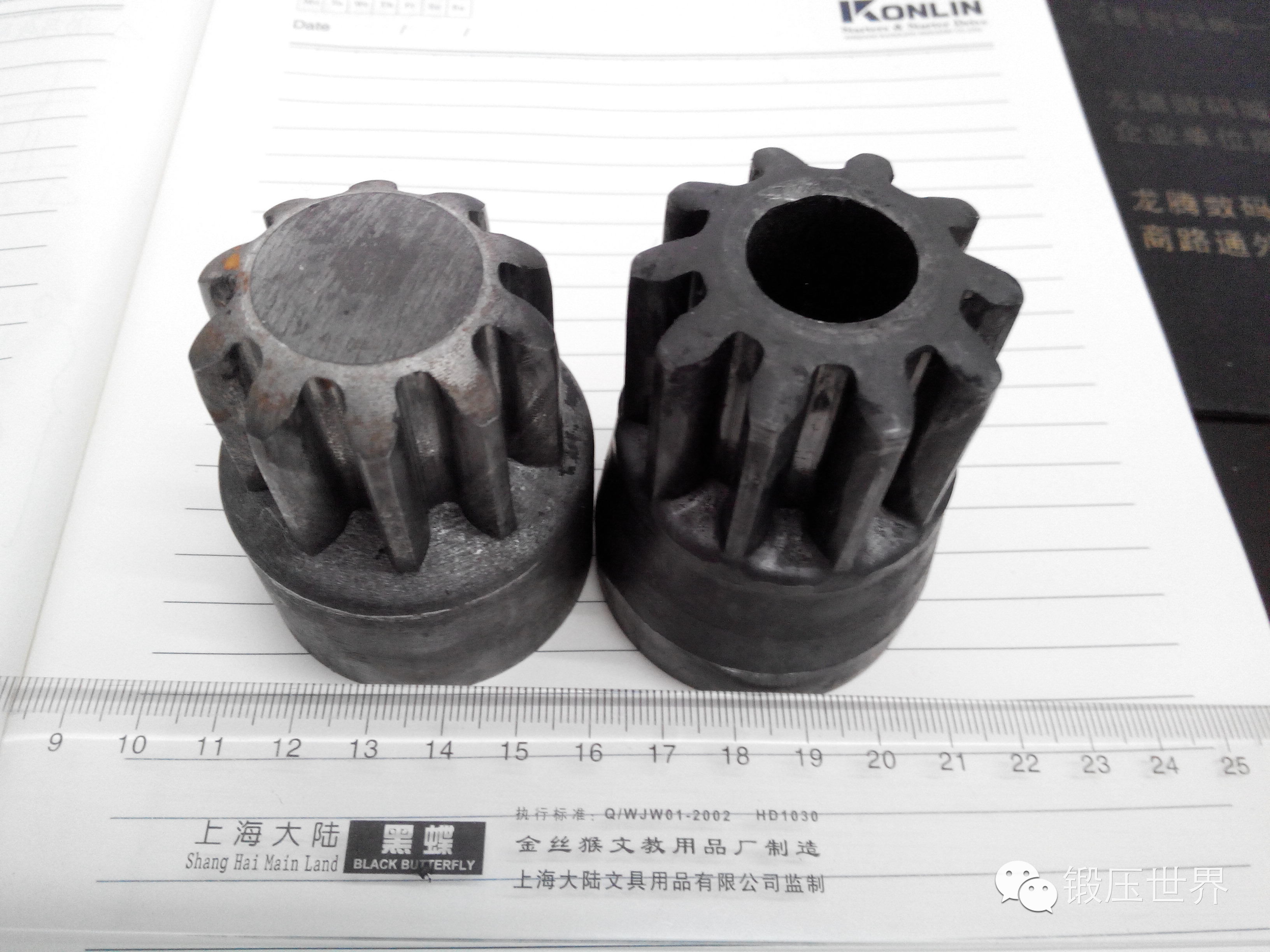 对典型齿轮零件进行了冷挤压试验,图11显示了不同方法得到的零件。图11a采用带孔和不带孔挤压,可以看出,采用带孔挤压,齿形前端不饱满较少。图11b显示了复合挤压,材料节省,切削量小。