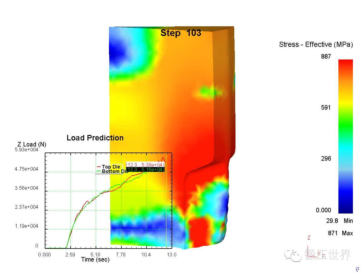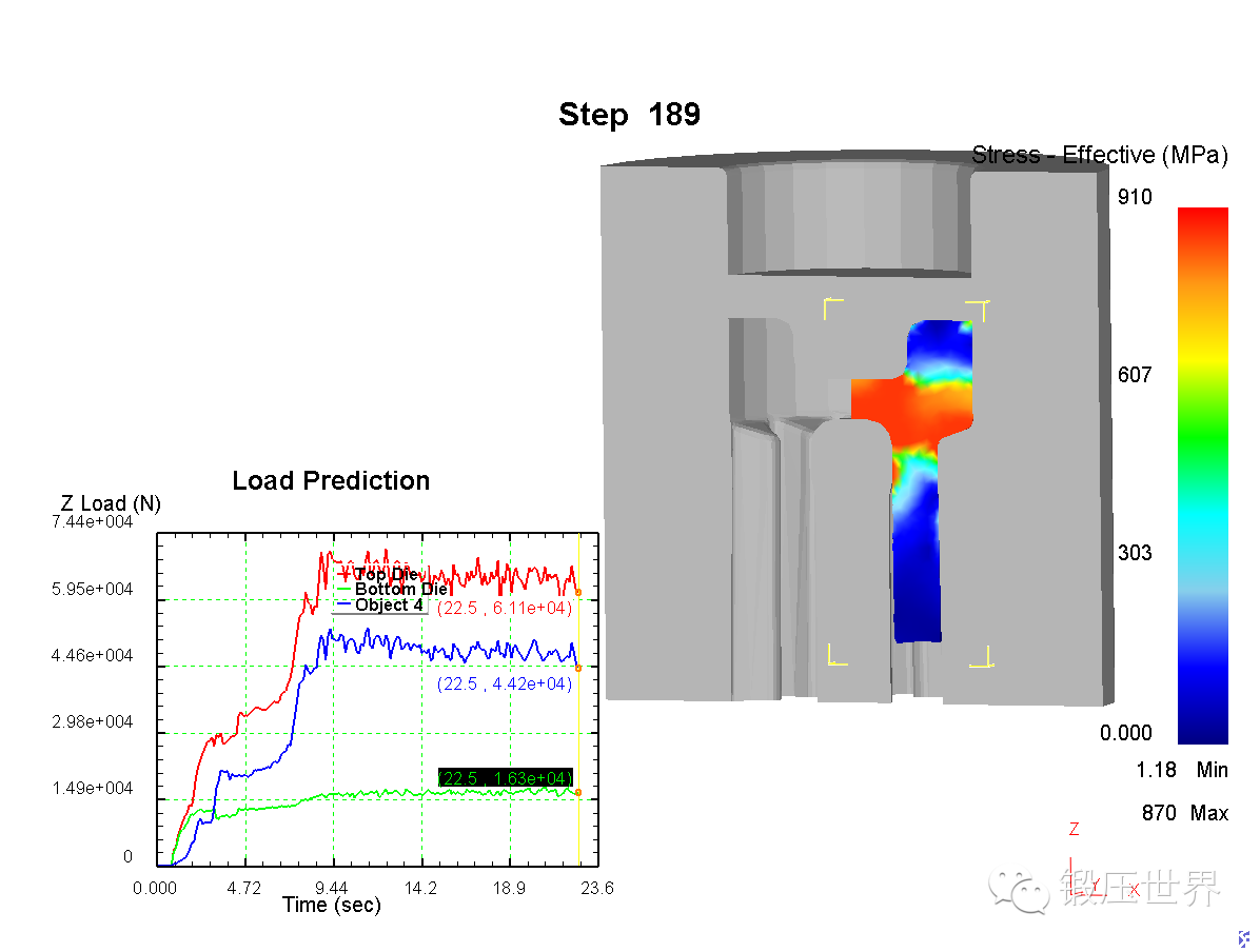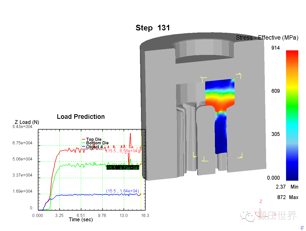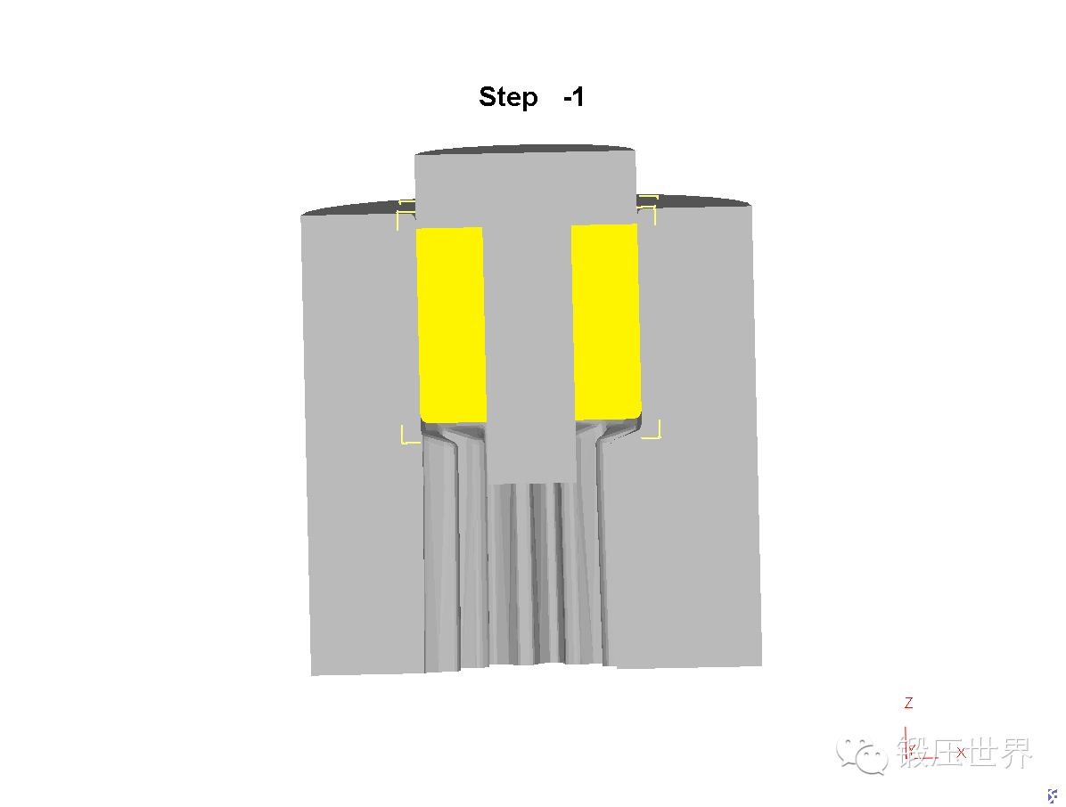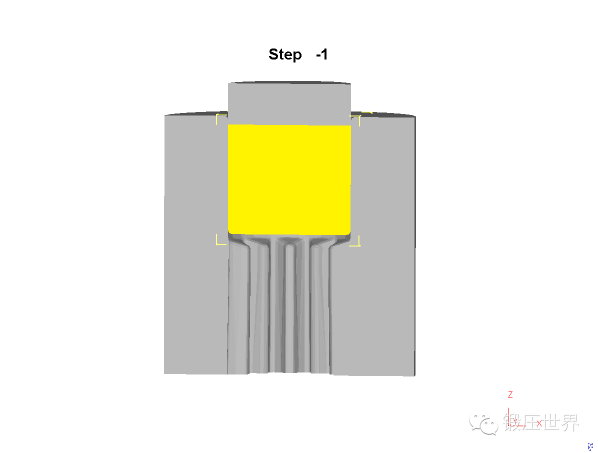 (5)复合挤压 通过上下模形状的优化设计,可对齿轮挤压过程进行复合挤压。图10显示了复合挤压过程。从图中可看出,复合挤压过程集合了冲头凸台和凹模芯棒的特点,也是先挤压凸台,然后再进行挤压齿形的过程。由于齿轮心部都有孔,因而采用复合挤压可以很好的降低材料消耗,降低切削量,是一种非常好的模具设计方法。