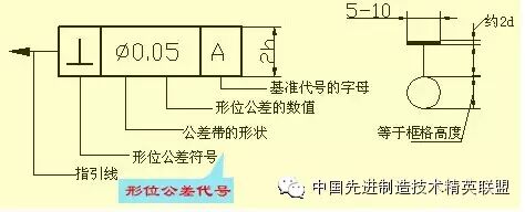 国家标准GB/T 1182-1996规定用代号来标注形状和位置公差。在实际生产中,当无法用代号标注形位公差时,允许在技术要求中用文字说明。 形位公差代号包括:形位公差各项目的符号,形位公差框格及指引线,形位公差数值和其他有关符号,以及基准代号等。框格内字体的高度h与图样中的尺寸数字等高。