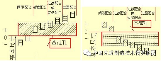 在制造配合的零件时,使其中一种零件作为基准件,它的基本偏差一定,通过改变另一种非基准件的基本偏差来获得各种不同性质配合的制度称为基准制。根据生产实际的需要,国家标准规定了两种基准制。 1)基孔制(如左下图所示)