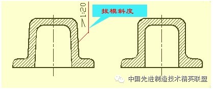 用铸造的方法制造零件毛坯时,为了便于在砂型中取出模样,一般沿模样拔模方向作成约1∶20的斜度,叫做拔模斜度。因此在铸件上也有相应的拔模斜度,这种斜度在图上可以不予标注,也不一定画出,如下图所示;必要时,可以在技术要求中用文字说明。