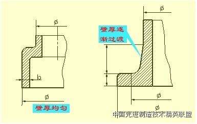 当铸件的壁厚不均匀一致时,铸件在浇铸后,因各处金属冷却速度不同,将产生裂纹和缩孔现象。因此,铸件的壁厚应尽量均匀,见上图;当必须采用不同壁厚连接时,应采用逐渐过渡的方式,见上图。铸件的壁厚尺寸一般采用直接注出。
