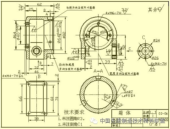 在标注尺寸方面,通常选用设计上要求的轴线、重要的安装面、接触面(或加工面)、箱体某些主要结构的对称面(宽度、长度)等作为尺寸基准。对于箱体上需要切削加工的部分,应尽可能按便于加工和检验的要求来标注尺寸。