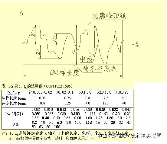 1)) 轮廓算术平均偏差(Ra)--在取样长度内,轮廓偏距绝对值的算术平均值。Ra的数值及取样长度l见表。
