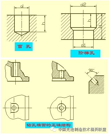 用钻头钻孔时,要求钻头轴线尽量垂直于被钻孔的端面,以保证钻孔准确和避免钻头折断。三种钻孔端面的正确结构。