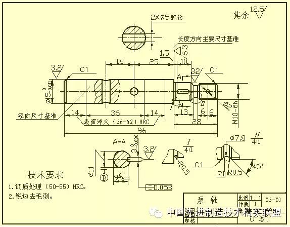 如图中所示的表面粗糙度为Ra6.3的右轴肩,被选为长度方向的主要尺寸基准,由此注出13、28、1.5和26.5等尺寸;再以右轴端为长度方向的辅助基,从而标注出轴的总长96。