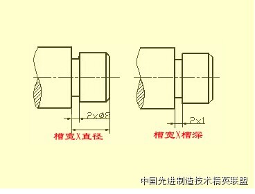 在零件切削加工时,为了便于退出刀具及保证装配时相关零件的接触面靠紧,在被加工表面台阶处应预先加工出退刀槽或砂轮越程槽。车削外圆时的退刀槽,其尺寸一般可按"槽宽×直径"或"槽宽×槽深"方式标注。磨削外圆或磨削外圆和端面时的砂轮越程槽。