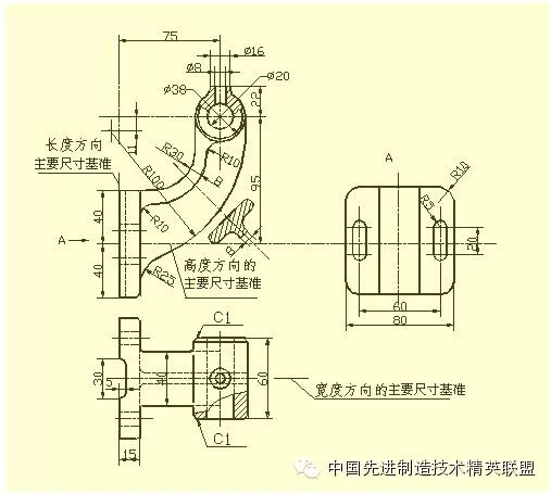在标注叉架类零件的尺寸时,通常选用安装基面或零件的对称面作为尺寸基准。尺寸标注方法参见图。