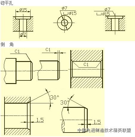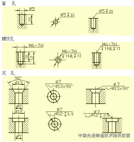 常见孔的尺寸注法(盲孔、螺纹孔、沉孔、锪平孔);倒角的尺寸注法。