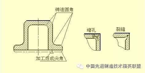 当零件的毛坯为铸件时,因铸造工艺的要求,铸件各表面相交的转角处都应做成圆角。铸造圆角可防止铸件浇铸时转角处的落砂现象及避免金属冷却时产生缩孔和裂纹。铸造圆角的大小一般取R=3~5mm,可在技术要求中统一注明。