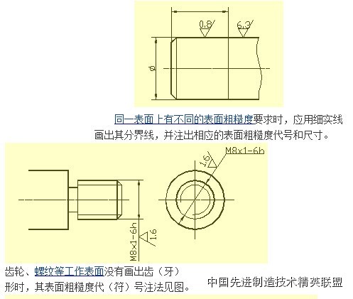 零件上连续表面、重复要素(如孔、齿、槽等)的表面和用细实线连接不连续的同一表面,其表面粗糙度代(符)号只注一次。