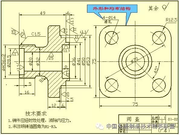 这类零件的基本形状是扁平的盘状,一般有端盖、阀盖、齿轮等零件,它们的主要结构大体上有回转体,通常还带有各种形状的凸缘、均布的圆孔和肋等局部结构。在视图选择时,一般选择过对称面或回转轴线的剖视图作主视图,同时还需增加适当的其它视图(如左视图、右视图或俯视图)把零件的外形和均布结构表达出来。如图中所示就增加了一个左视图,以表达带圆角的方形凸缘和四个均布的通孔。