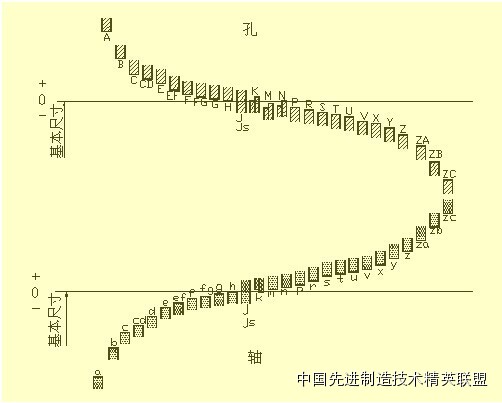 基轴制--是指基本偏差为一定的轴的公差带与不同基本偏差的孔的公差带形成各种配合的一种制度。见右下图。基轴制的轴称为基准轴,其基本偏差代号为h,其上偏差为零。