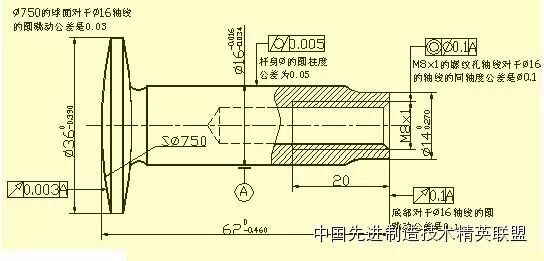 一根气门阀杆,在图中所标注的形位公差附近添加的文字,只是为了给读者作说明而重复写上的,在实际的图样中不需要重复注写。