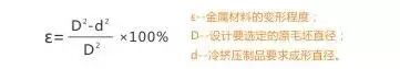 式中ε、d是已知条件,求解D。ε :不同的材料有不同的允许变形程度;延伸(缩径)工艺前面介绍的作者根据多年的实践经验,将ε =30%界定为分水岭, ε≤30%用开式冷挤压成形(开式缩径), ε >30%用闭式冷挤压成形(闭式缩径或称为强缩模亦称强束模),闭式冷挤压成形ε值的上限一般根据材料的允许变形程度来决定,不锈钢 ε≤50%,一般黑色金属常用的控制在ε≤60%,中、低碳钢有的可以达到 ε=80%。