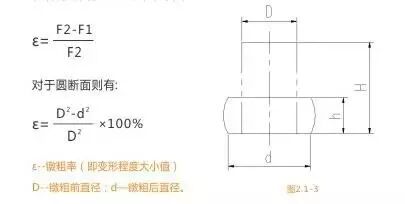 使原毛坯的横断面积增大而高度减小工序叫做镦粗。(见图2.1-3),其变形程度ε以镦粗后的断面积F2和镦粗前的断面积F1之差,与镦粗后的断面积F2之比来表示,即: