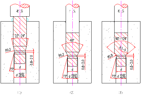 如图2.1-5,图(1)是减径模,是材料的一部分露出模腔的外面进行缩经,延伸率ε可以达到28%;图(2)、(3)是材料全部进入模腔内进行缩径,延伸率ε 可以达到75%,这种模又叫挤压模,而把用R缩径的图(3)特称为R缩径模。