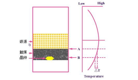 温度梯度法是在高温高压条件下,石墨转化为金刚石并溶于触媒中,在一定温度梯度驱动下扩散并在晶种上开始生长。即由于温度的不同,金刚石将由高温处的高浓度区向低温处的低浓度区扩散,并在低温晶种处结晶析出。温度梯度法的生长驱动力(过剩溶解度)与轴向温度梯度正比。